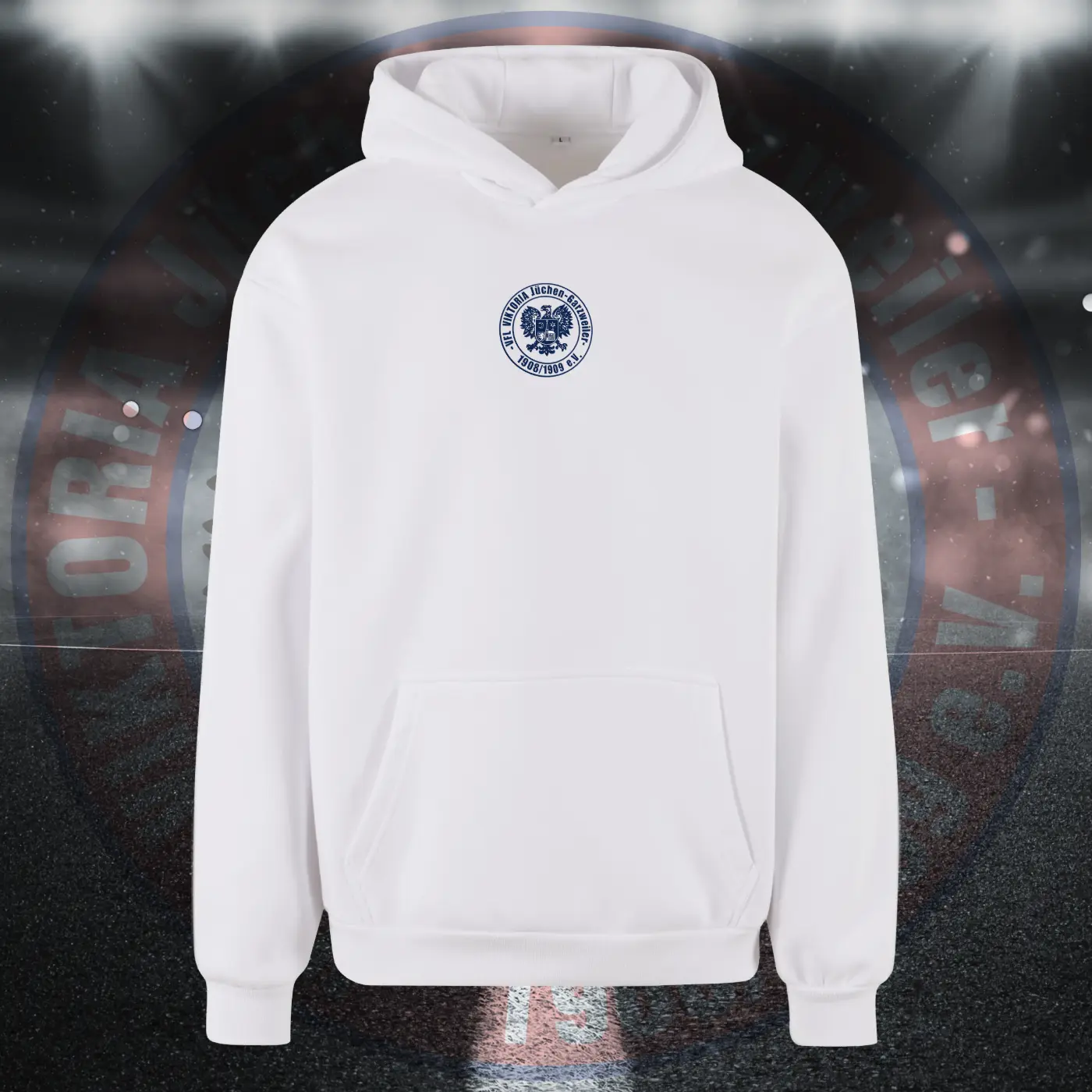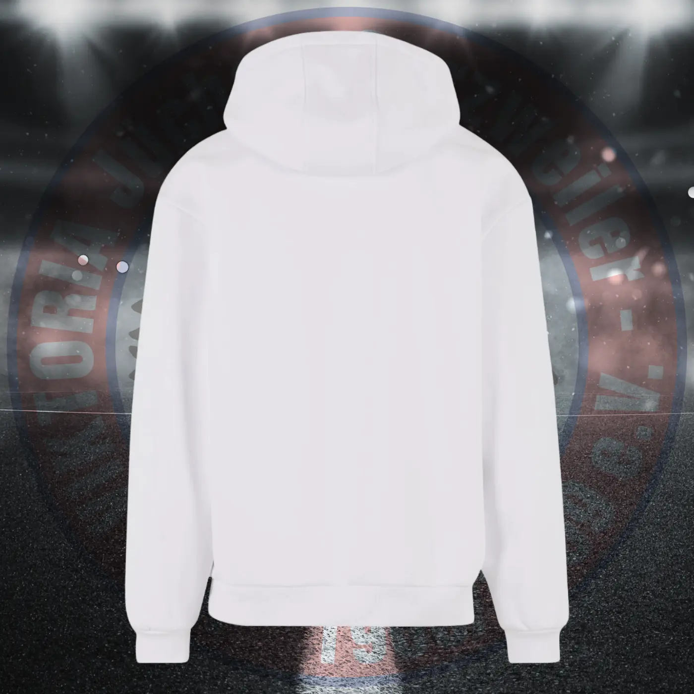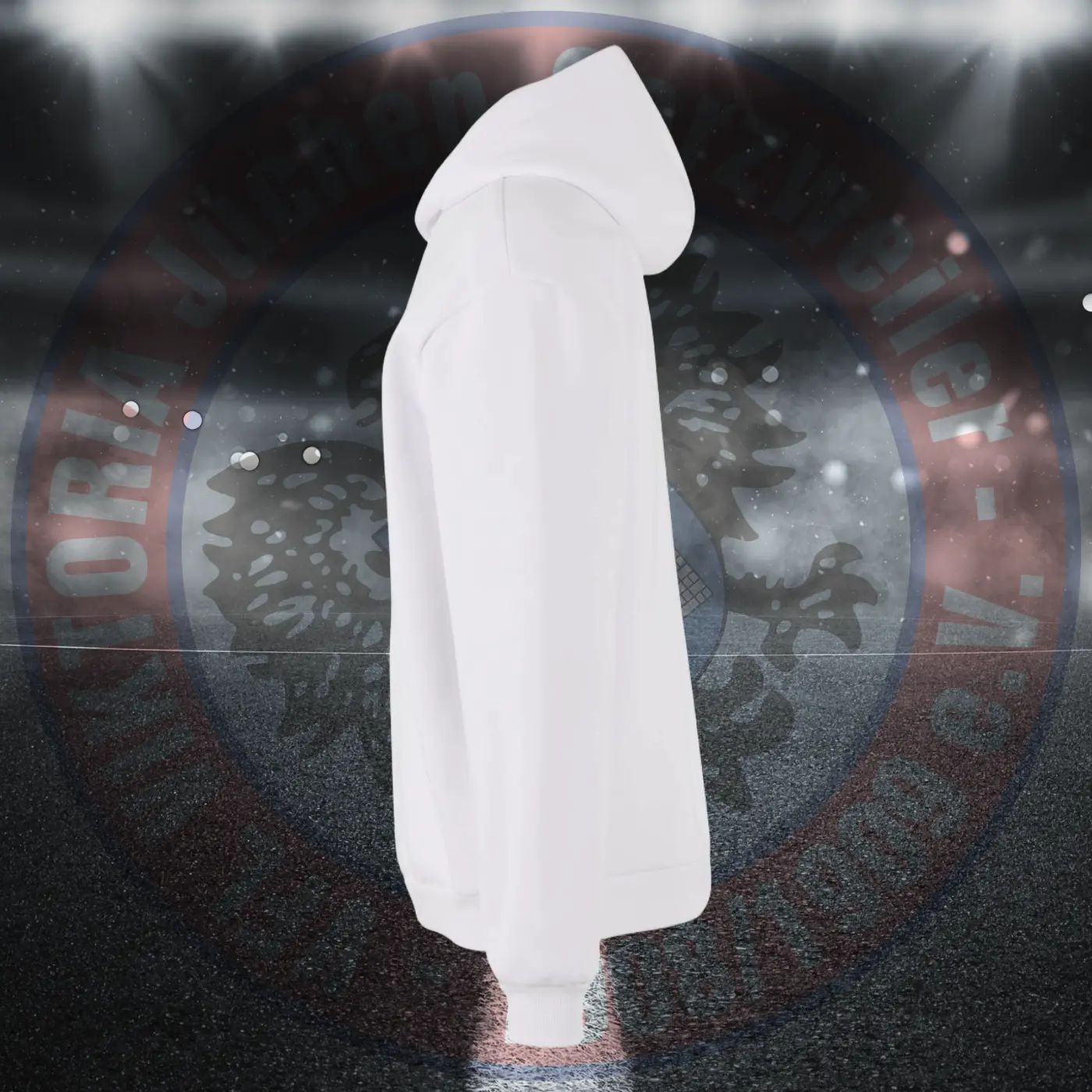 Dieser hochwertige Hoodie in klassischem Weiß ist das offizielle Teamwear-Piece der ersten Mannschaft des VfL Viktoria Jüchen-Garzweiler. Auf der Brust sorgt das dunkelblaue Vereinslogo für einen markanten, sportlichen Look mit starkem Wiedererkennungswert.